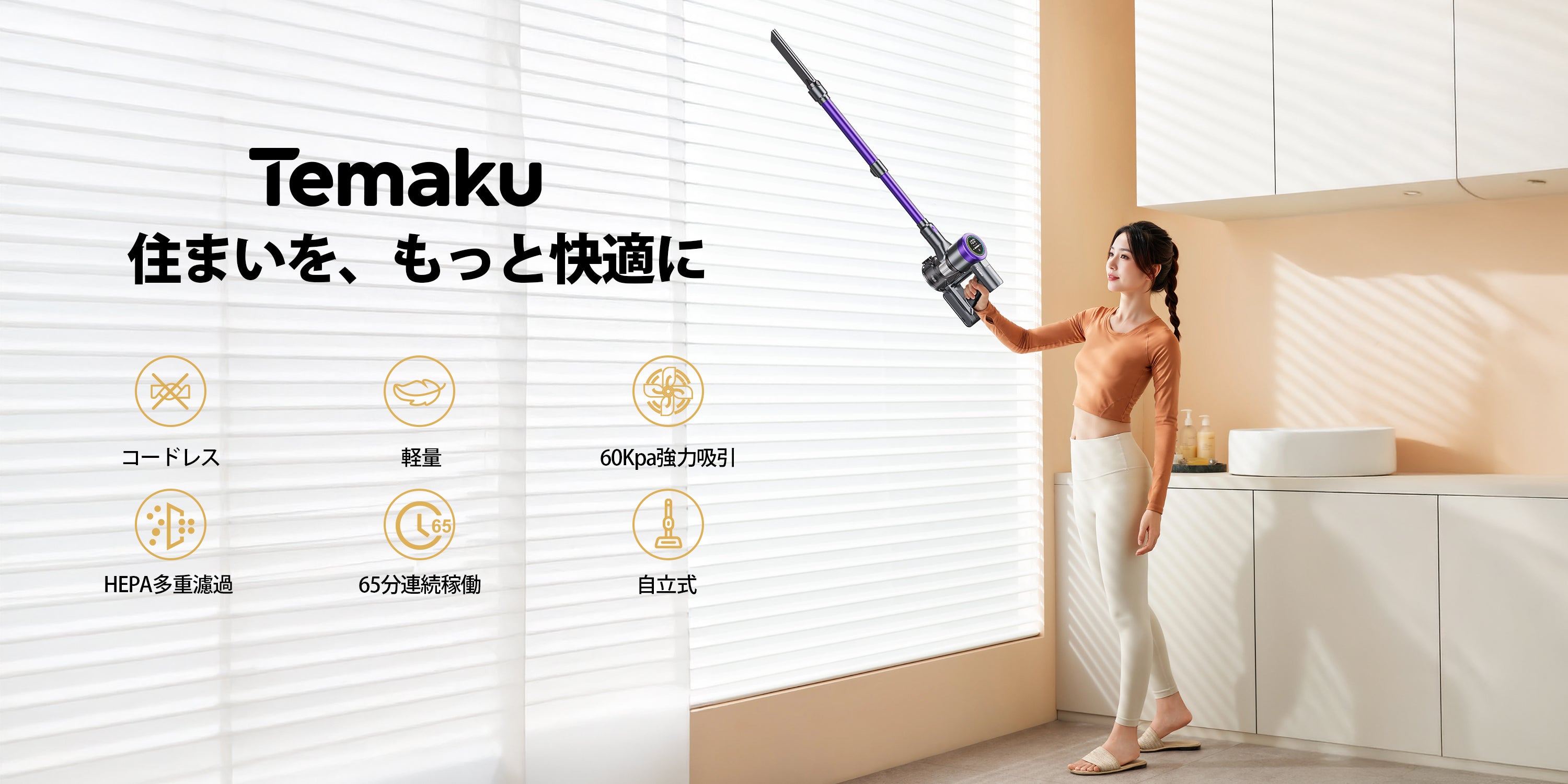 掃除機 コードレス【2026年モデル先行発売!業界トップレベルの80KPa超強力吸引・65分連続稼働・自立式・低騒音・AI汚れ自動検知】 Temaku サイクロン軽量 掃除機 コードレス 伸縮型パイプ/革新版グリーンLEDライト/次世代LED液晶ディスプレイ 550W 3段吸引力絡まないヘッドHEPA多重濾過着脱式バッテリー 畳/カーペット/フローリング/ソファー/車用/隙間/3年保証